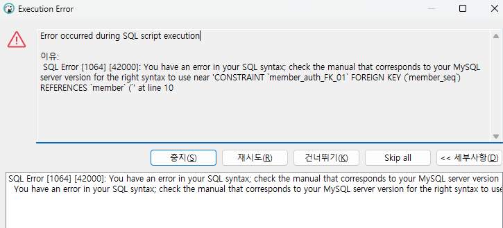 [MySQL] SQL Error [1064] [42000]: You have an error in your SQL syntax; check the manual that corresponds to your MySQL server version for the right syntax to use near ......... 본문