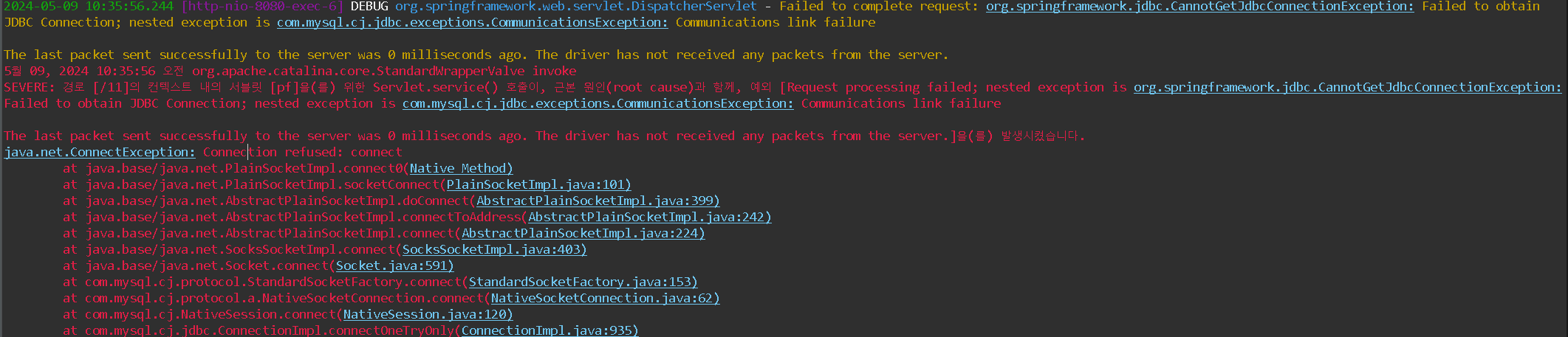 - 현재 개발 환경은 도커를 이용한 MySQL 사용 중이다. 해당 DB정보가 jdbc 연결에서 되지 않아서 일어난 문제 이다.
