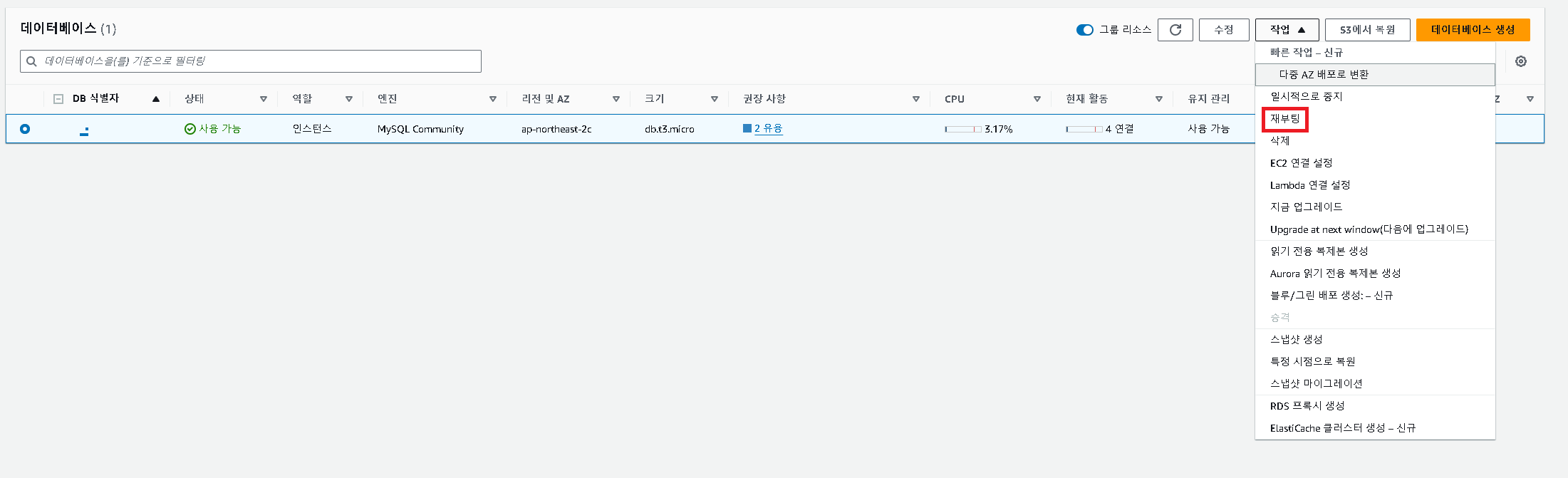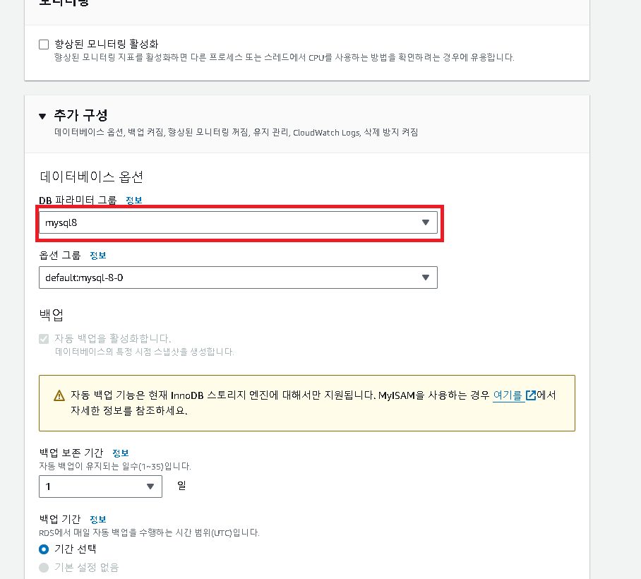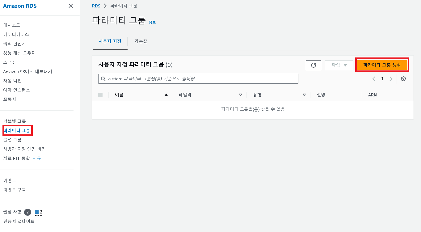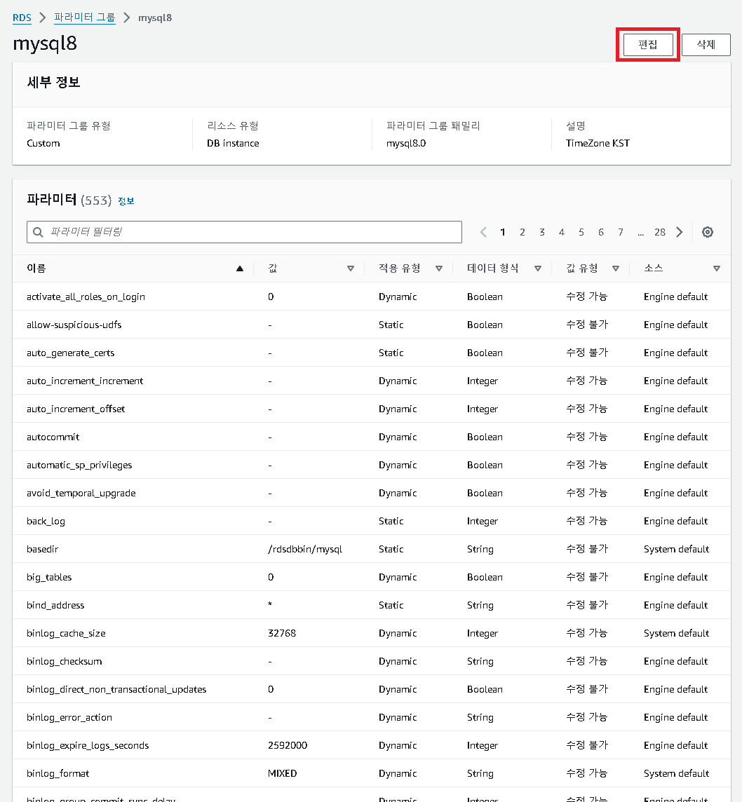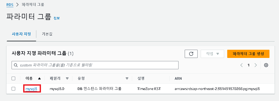 [수정] -> [추가 구성] -> [데이터베이스 옵션] ->[DB 파라미터 그룹]->[계속]