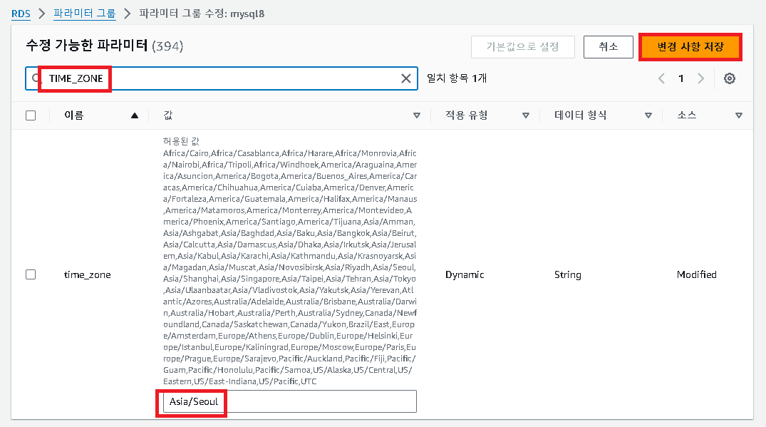 위에 순서 대로 들어와서 아래에 'TIME_ZONE'을 검색해서 'Asia/Seoul'을 추가 후 변경 사항 저장 해주자