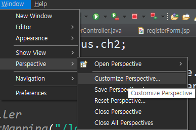 Window - Perspective - Customize Perspective... [클릭]