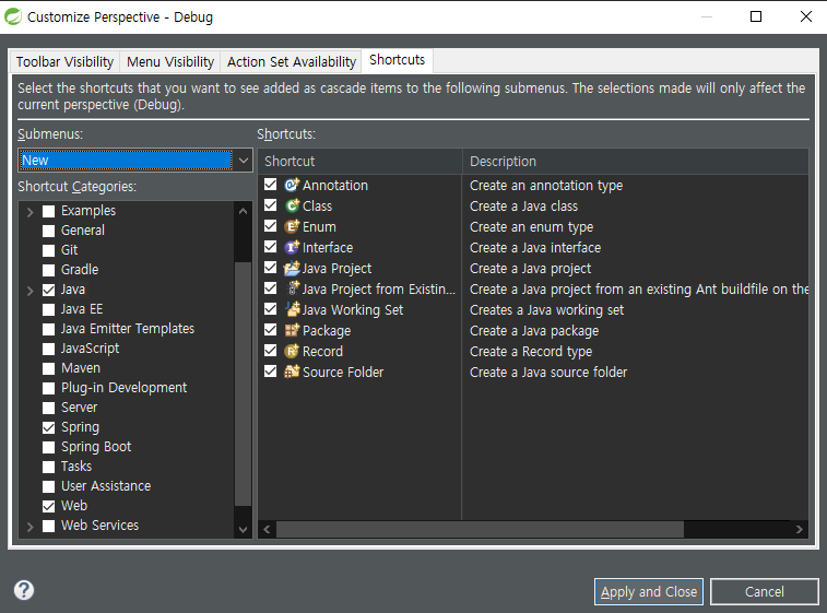 Shortcuts - New - [원하는 기능 선택] - Apply and Close [적용]